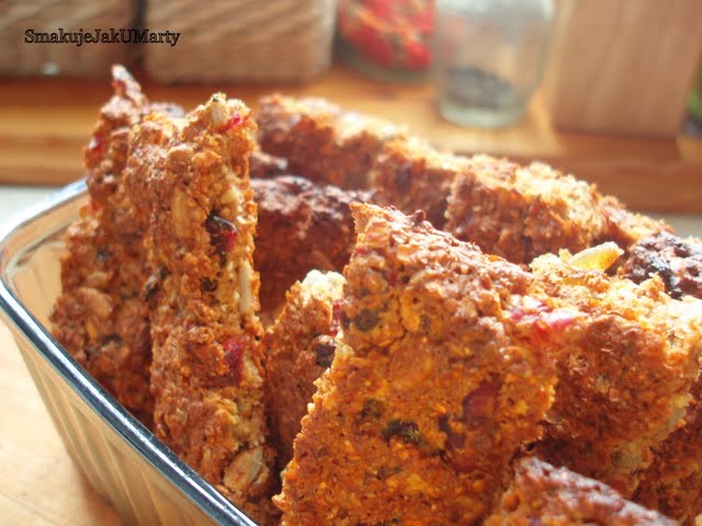 Zaraz po wyciągnięciu z piekarnika, jeszcze ciepłą masę pokroiłam w prostokąty tworząc małe batoniki. Ważne by ciąć ciepłą masę, ponieważ już przestudzona będzie się kruszyła.